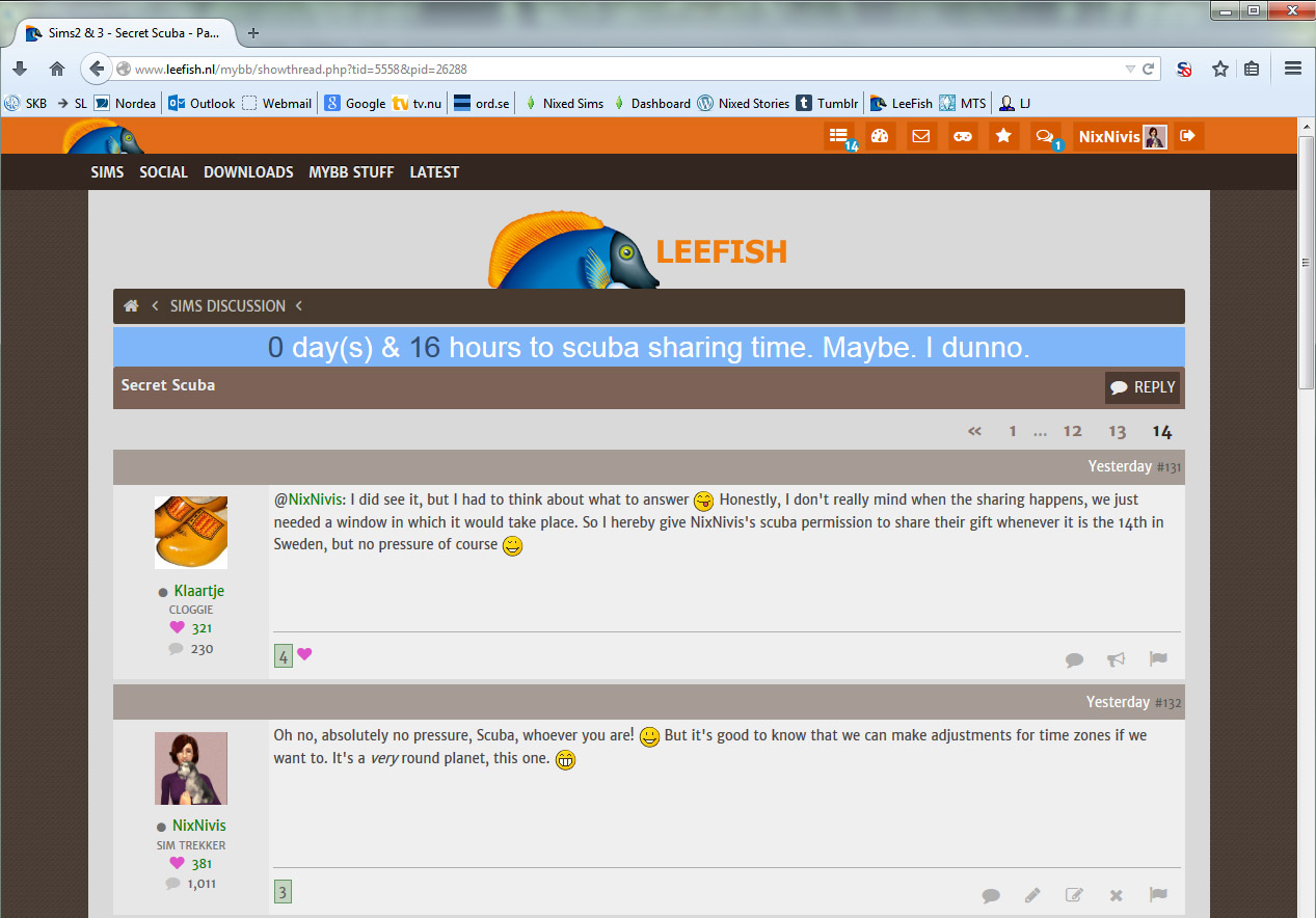 @NixNivis: I did see it, but I had to think about what to answer Tongue Honestly, I don't really mind when the sharing happens, we just needed a window in which it would take place. So I hereby give NixNivis's scuba permission to share their gift whenever it is the 14th in Sweden, but no pressure of course Wink
