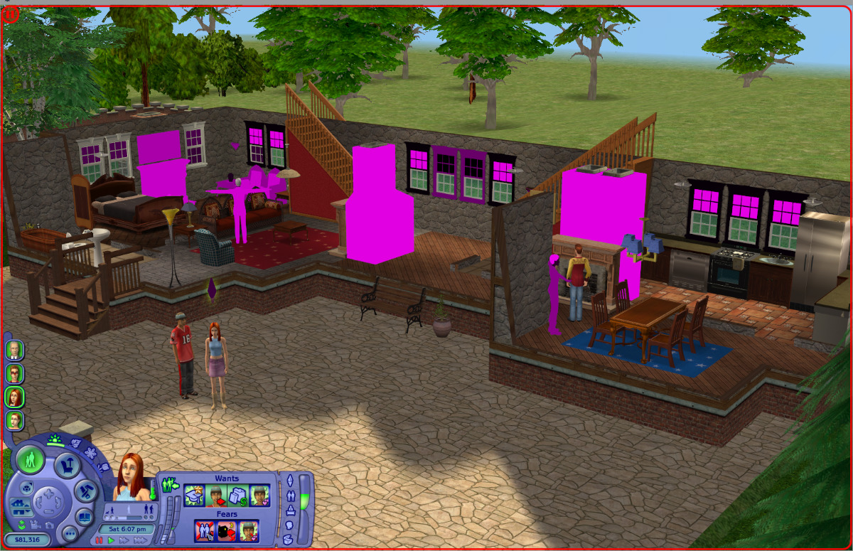 Tweak the line in Graphics Rules about managing texture memory (crucial), and probably grab a noCD.exe and apply 4GB patch = crashes cease, but now you have different variants of flashing pink. (Sometimes in hood view, sometimes in lot view, sometimes hood and lot will be fine, then a few minutes into playing the lot, pink, including the sims themselves, who are pink and float around in the 'milkshape' pose.)