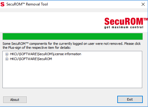 Running the secuROM removal tool directly from the .rar file yielded only this result, saying both the license and main program still remain on my system.