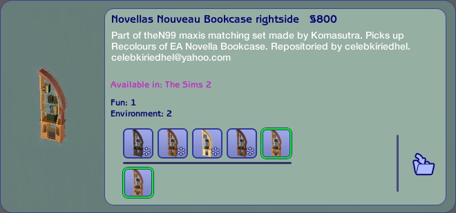 Kiri check out your GMND > tsMaterialsMeshName, I think you will find you have put the Name and String (CRES) backwards. It should read bookcaseartnouveau_wood_mahogany = (String) bookcaseArtNouveau and bookcaseloft_books = (String) bookcaseArtNouveau . I will change it and check it in game for you I changed it and checked it out, it's working now. You might also like to give it a new GUID as the 2 files you sent appear to have the same GUID.