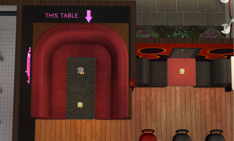 I THINK I have finished my club, but I do need a tester for the big booth seat near the toilets. Wanted: confirmation that a group of sims on a social outing will be able to use that table and be served food and eat it from the table.