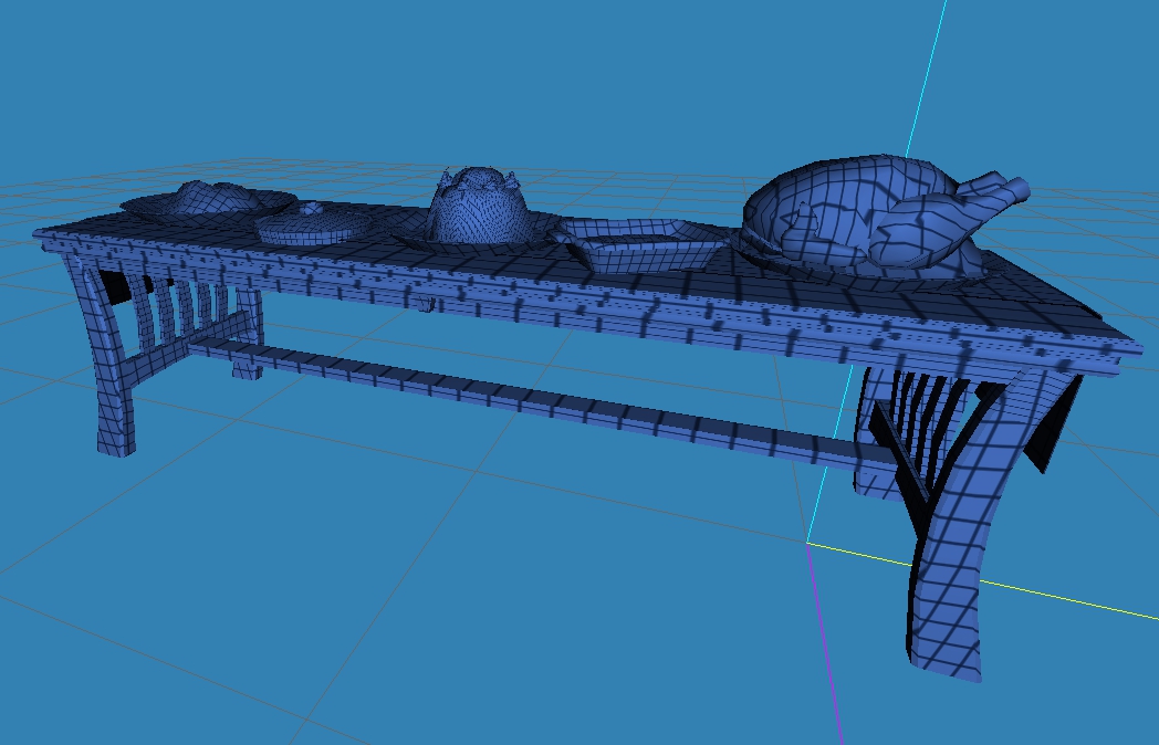 I have some party type stuff I'm already sitting on (like the drinks dispensers and crockpots - chili and mac and cheese - bellow), and then the other day, out of the blue, I had an urge to make more "homey" looking buffet tables. I'm not sure yet how the anims will look since I lowered the serving platters, and I haven't really made it out of MS3D yet, but Lee asked so here's a look at what's going on so far.