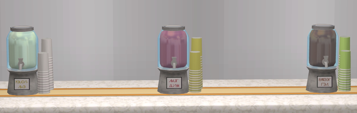 Also threw on a couple more pics of the drink dispensers morphs, "half" full and empty. It's cloned from the quick meals (the cans) so sims just pull it from the fridge and stick on the counter. The individual drinks don't change states because the cans don't since you can't see inside them, so it always looks full even when it's finished. But I'm still pretty happy with it.