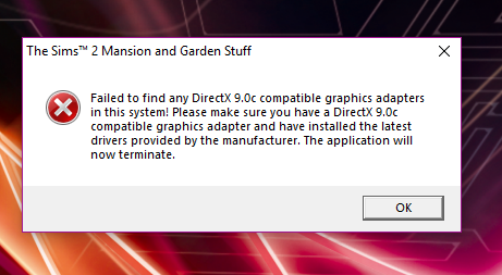 This is a brand new laptop, it doesn't have an onboard graphics card, only has NVidia 1060 dedicated card. I downloaded the game from my Origin account (so it's Ultimate Edition and should be valid), and I've managed to play TS2 fine on a previous Windows 10 computer, but for some reason it's just not having it on this one. I also looked into downloading DirectX 9, but the link I tried said it wouldn't work unless I had like Windows 98, and I don't think that's actually the problem. I also turned off Origin In-Game as apparently that's given some people trouble, but nothing has worked :/