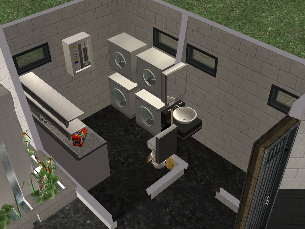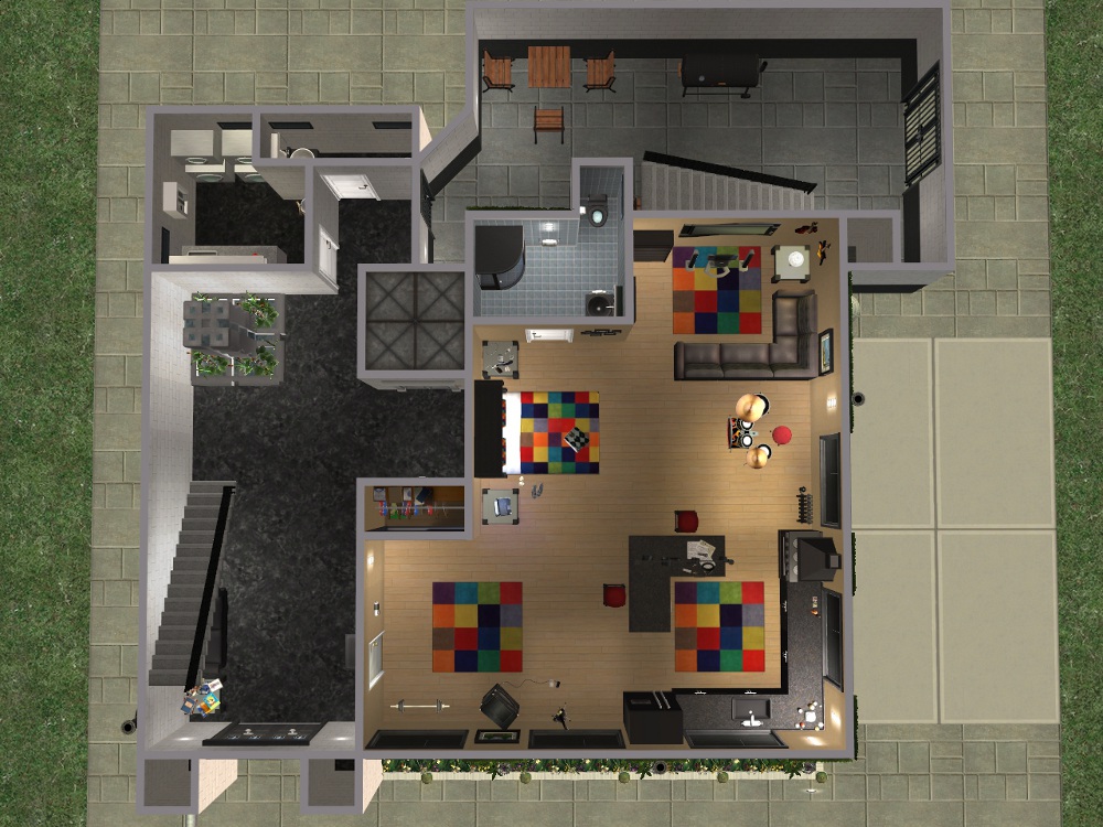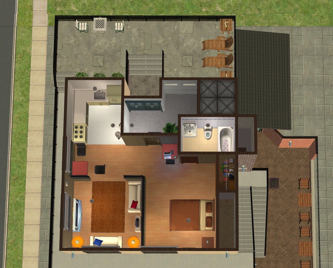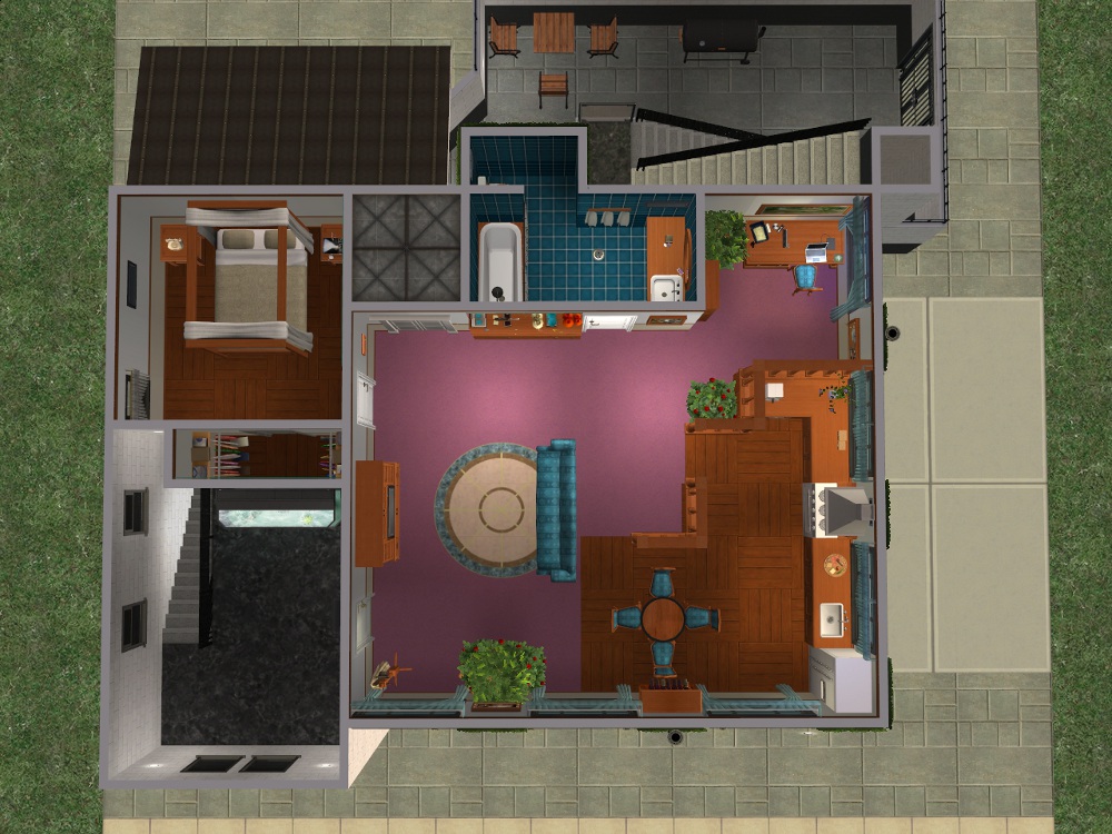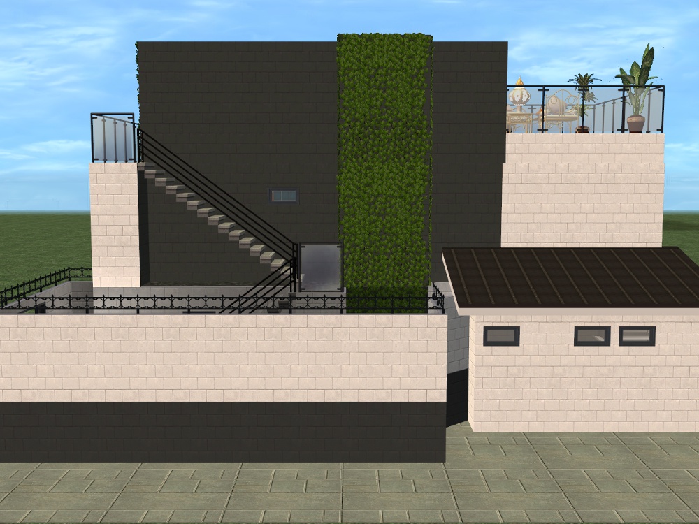 Sim amenities: laundry room (stole idea from Shell), bbq area in the back - part of wall replaced with a fence cos of a rampant simdozer during renovations. Roof area - chess table loungers. DID have a hot tub but removed cos tester sims just lived in the darn thing.