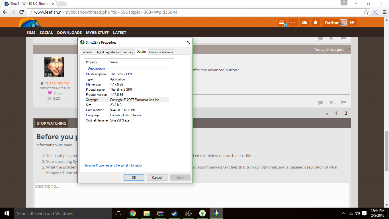 Also can you show me the compatibility tab for your sims2SP9.exe? You can find that in