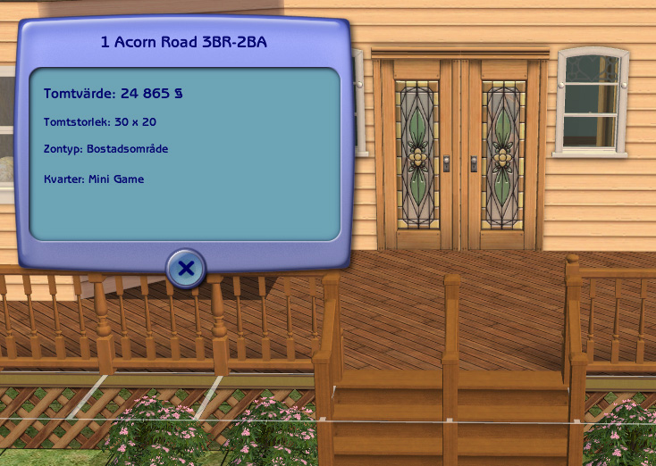 (Re the lot info screenie, tomtvärde = lot value. I didn't think to use my English AnyGame for this.)I honestly don't remember what comes from which EP, but I've had all EPs installed for this. I also used items from the IKEA SP. The only CC I've used is iCad's stair recols and my own Leefish mobile. All games have to have a Leefish mobile.