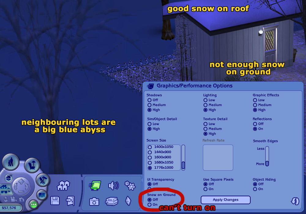 But.... it screwed up some other things. I took some screenshots to show what got messed up. These things (except for "refresh rate") work fine with my old "Graphics Rules.sgr" so I guess it's a matter of copying the bits that fix smooth edges from your file into my old file. (Which bits would those be? I'll have a look and update this post if I figure it out.)