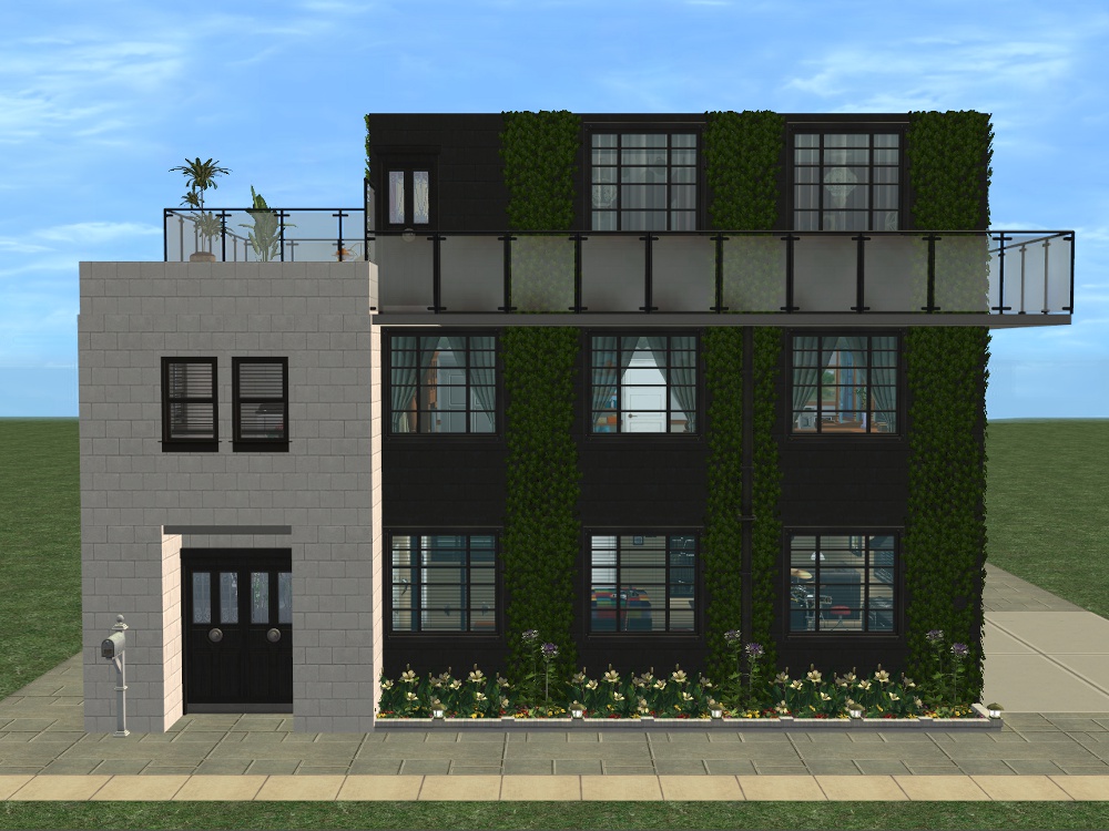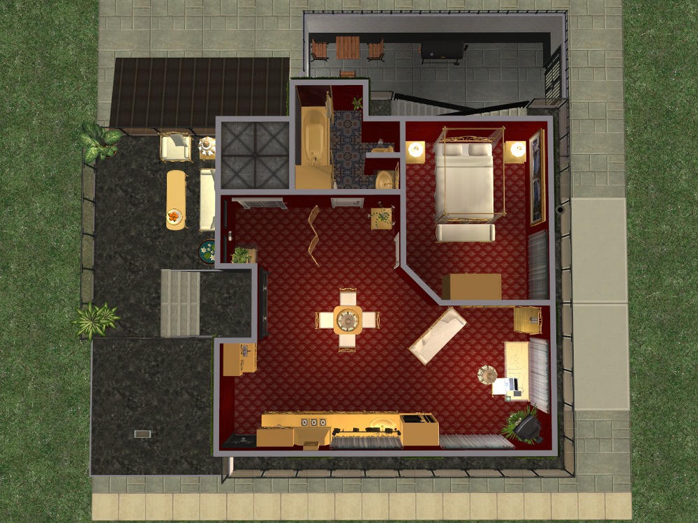 Sim amenities: laundry room (stole idea from Shell), bbq area in the back - part of wall replaced with a fence cos of a rampant simdozer during renovations. Roof area - chess table loungers. DID have a hot tub but removed cos tester sims just lived in the darn thing.