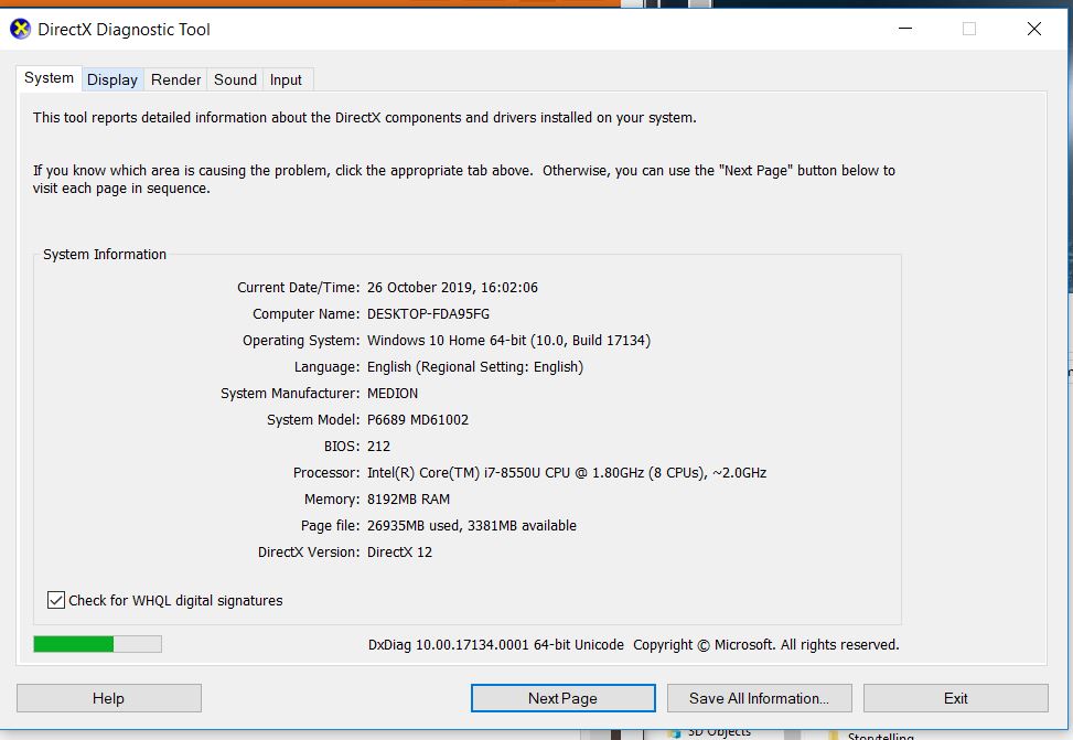 I wonder, however, why you add a *picture* of a DxDiag screen. It would've been more helpful if you had waited for DxDiag to finish its diagnosis, had then pressed the "Save All Information" button at the bottom, and had finally sent us the DxDiag.txt file that it saved.