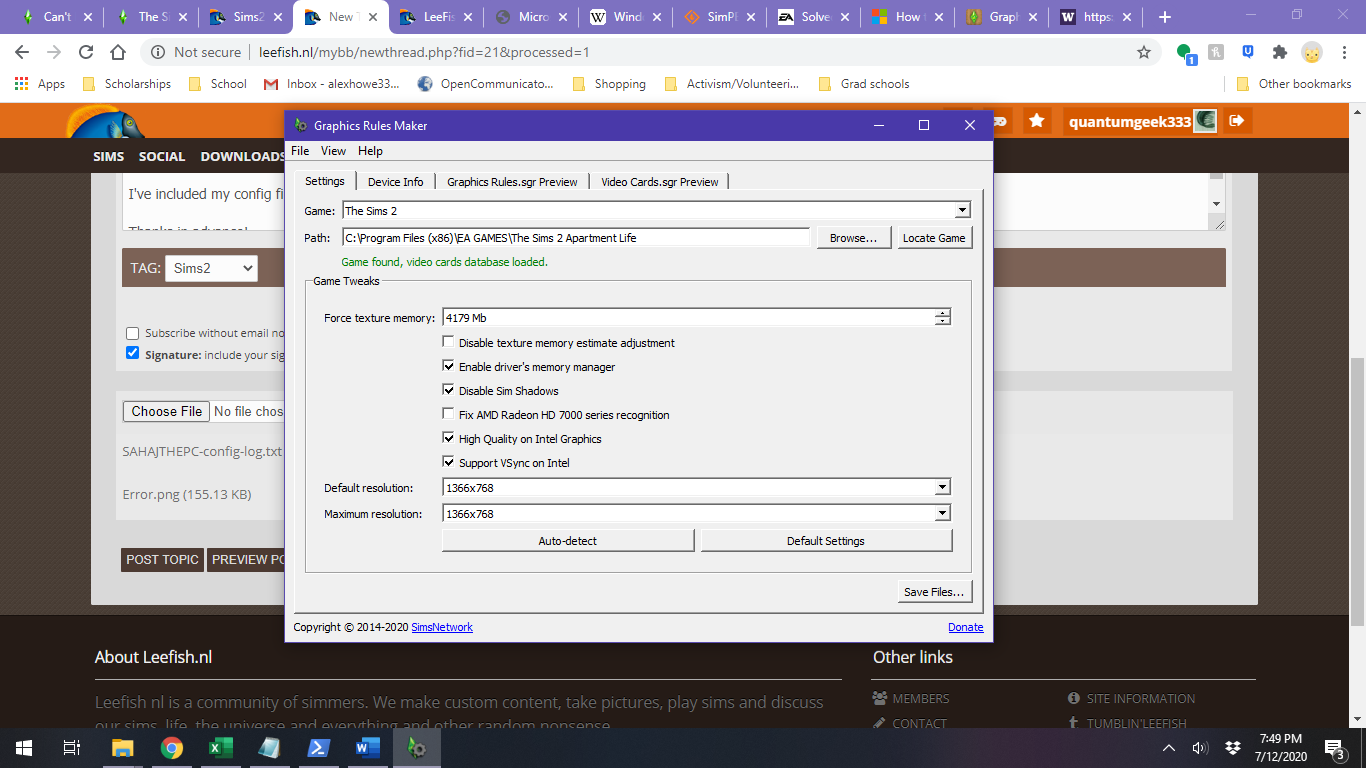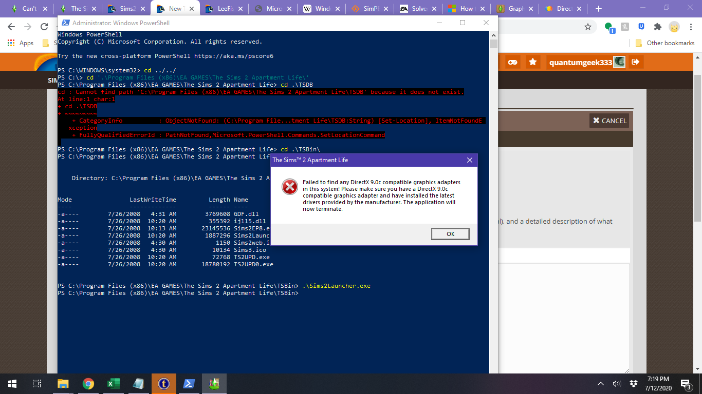 I'm having the classic "Failed to find any DirectX 9.0c compatible graphics adapters" error whenever I try to run TS2--the only way I can get the game to run is in windowed mode, which isn't particularly fun. I'm running Windows 10 with an Intel graphics card from 2018 (which you'll be able to see in my config-log file). I've tried many different things--I can tell that this is an issue with my video card not being recognized, so I used the Graphics Rules Maker to add my card to the database, which seemed to work since the card is being recognized in my config file, but I'm still getting the same DirectX error message. I've double checked that the path to the game is correct (Apartment Life is my most recent expansion, and the files are being modified in the AL folder, so that shouldn't be an issue), and I've even run dxdiag to make sure my card supports DirectX (it does--I have DirectX 12.0). It sounds like even though my card is in the database now, there is some sort of disconnect that makes the game not take advantage of my card or its features somehow.