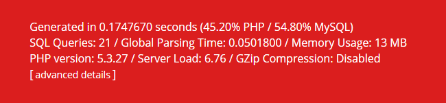 Shows Server load, parse time, generation time, Gzip compression, etc on the bottom of all pages in the root folder. Please note that only administrators see this information.
