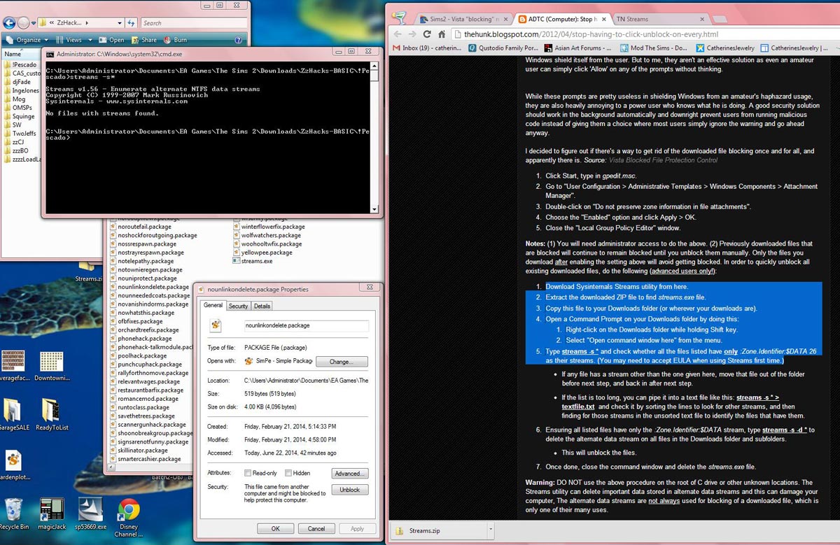 ETA: *Big breath* OK. I tried it... The instructions are in blue high-light on the black page. The black cmd box says it couldn't find anything... yet, there's my nounlinkondelete file's property box saying the files is 'blocked'