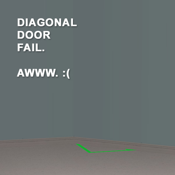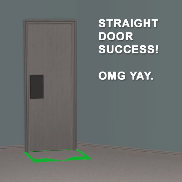 So yeah. I tried to make a door. The straight version was a wild success. Pulls textures from the basegame JustaDoor. Uses a texture in the file for the flat handle (taken from the Maxis restroom door). Does not show any male/female sign on the door. And allows both genders to pass through. All that was my goal for this door, and it all works on the straight version.