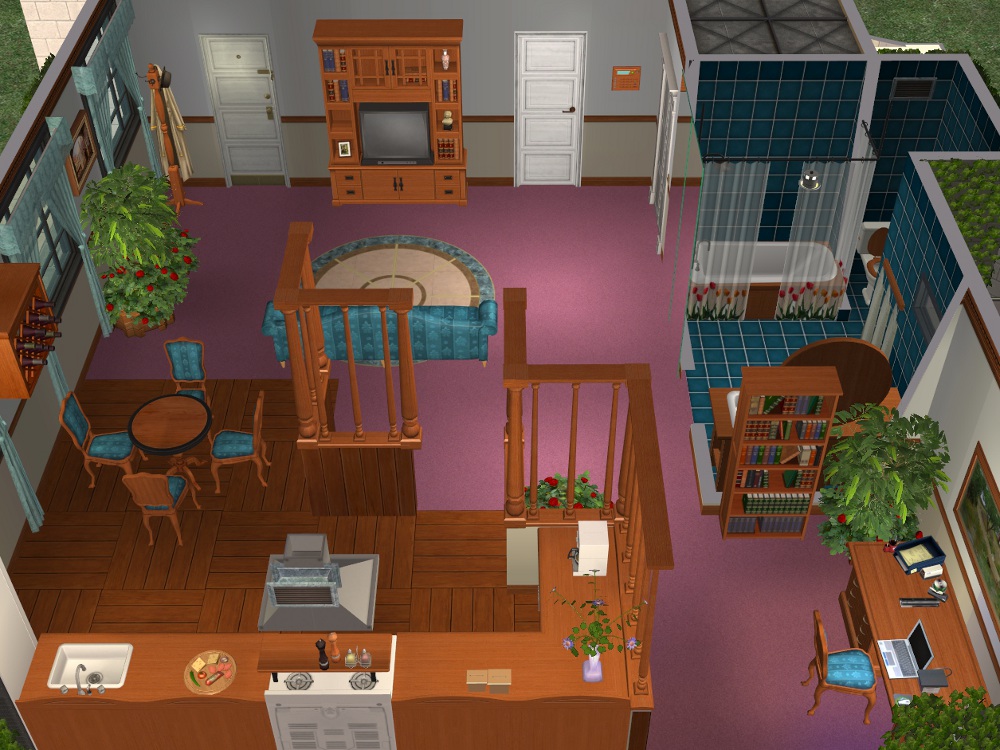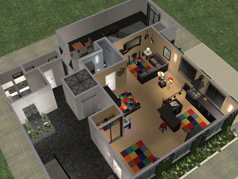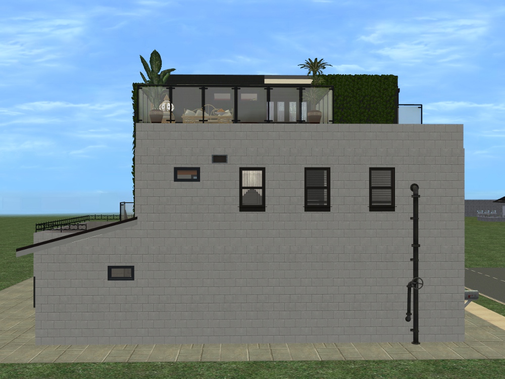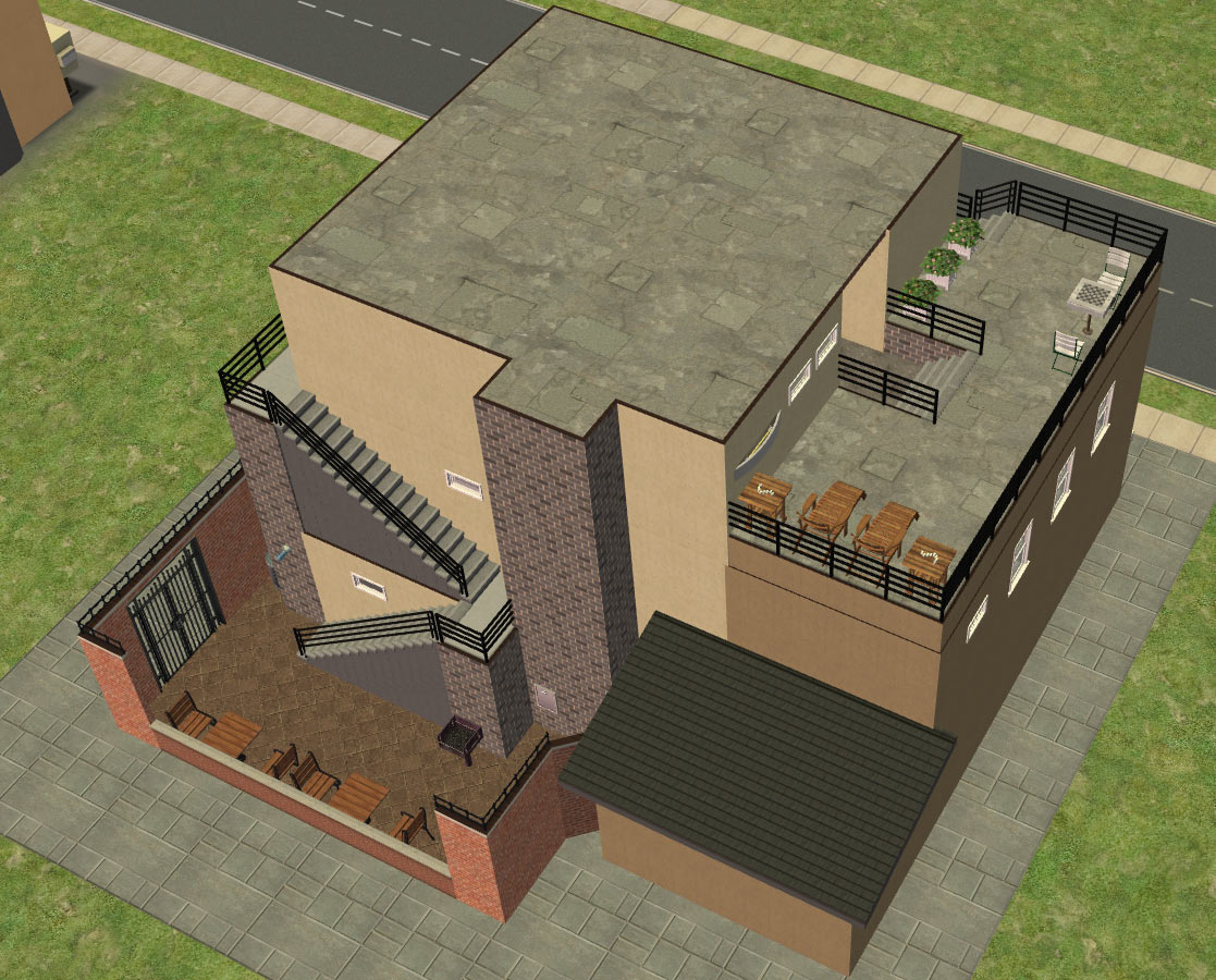 Sim amenities: laundry room (stole idea from Shell), bbq area in the back - part of wall replaced with a fence cos of a rampant simdozer during renovations. Roof area - chess table loungers. DID have a hot tub but removed cos tester sims just lived in the darn thing.