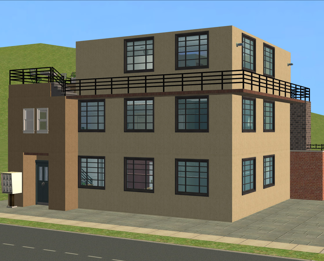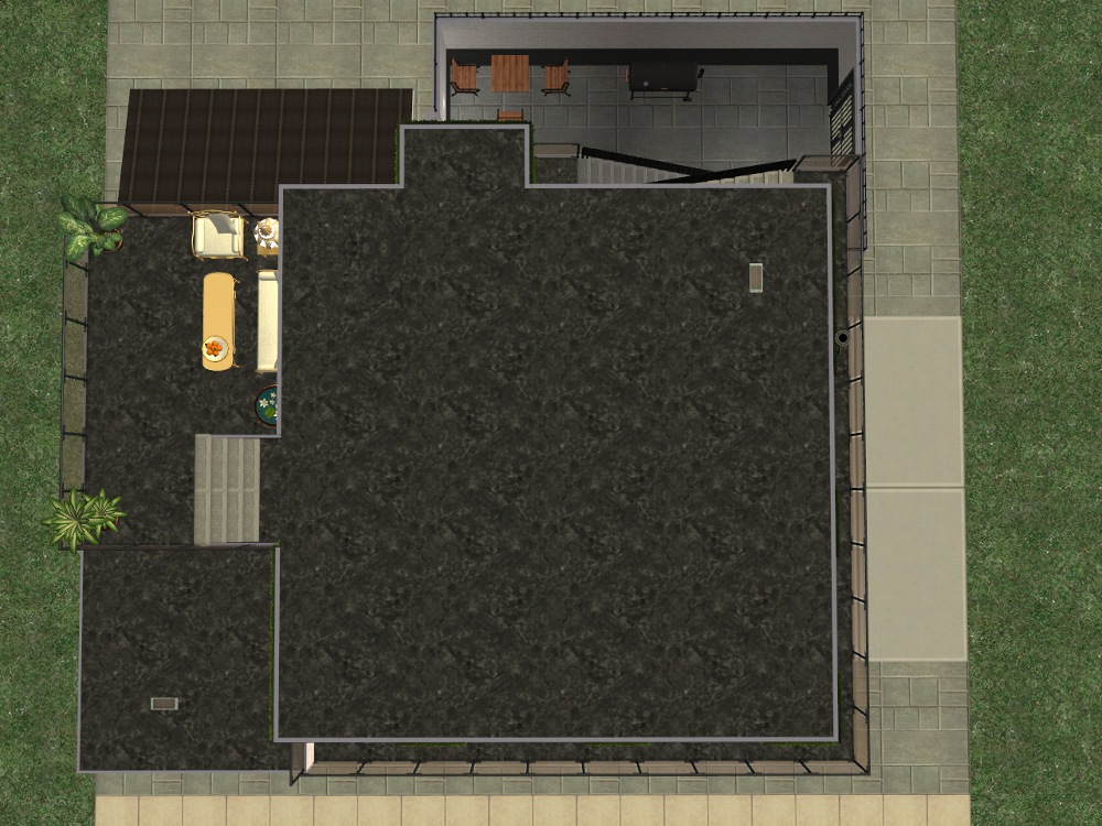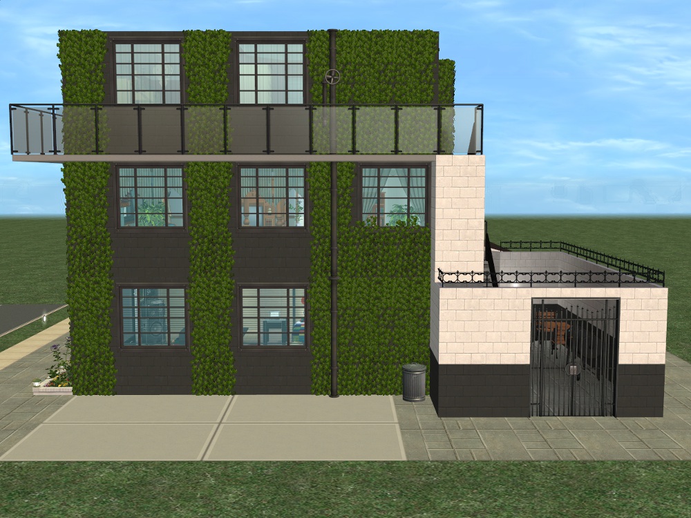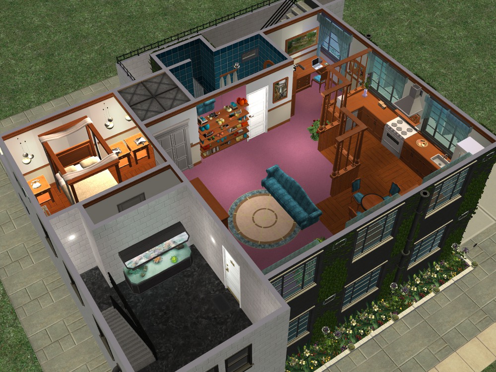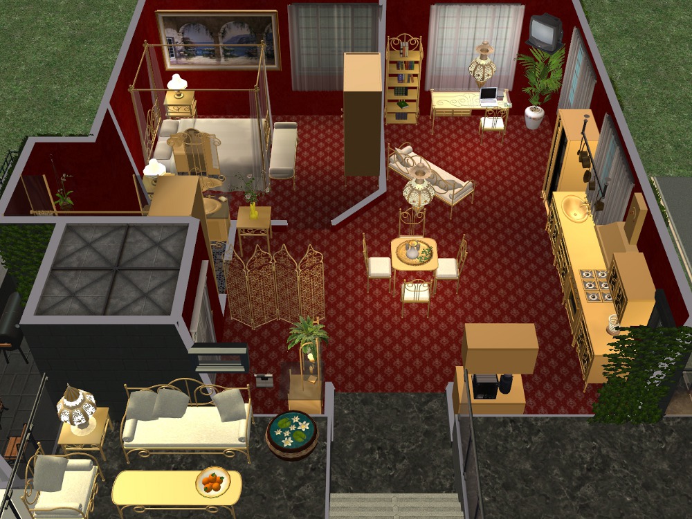 Sim amenities: laundry room (stole idea from Shell), bbq area in the back - part of wall replaced with a fence cos of a rampant simdozer during renovations. Roof area - chess table loungers. DID have a hot tub but removed cos tester sims just lived in the darn thing.