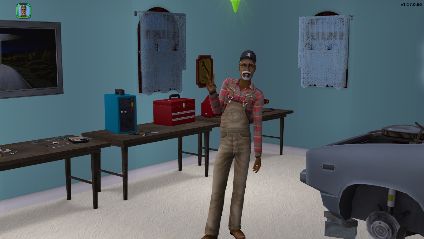 Bob Woods, is my "test" Sim, and my official housing inspector. He is a retired "City Planner", and my most important Sim. Any house I build, or any Maxis made house, must be "Bob Woods approved" before a Sim family is moved in. He has a '69 Ford Truck, and is moved in to any new house, to test how well a Sim can get around in it, how well the garage works, etc. That way, there's a minimal amount of "Arguing over position", when the family moves in. He is also the repairman in all my hoods. Bob is invited to a Sim's house (He knows ALL the Sims in whatever hood he's in) when their computer, TV, Dishwasher, etc. breaks down. He's made temporarily "selectable", and fixes the appliance. He is then paid by the family either in barter, or cash. Bob has multiple gold badges, that include Fishing, Robot making, and Gardening. He is truly, *THE* "All-Star" Sim!