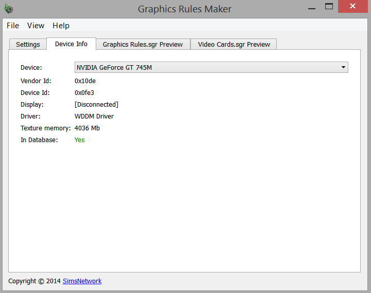 *Also, while I am in the Graphics Rules Maker, it is showing 'disconnected' for display under the device info tab when I have my NVIDIA card selected from the drop down. What does this mean? It sounds concerning! See attached screenshot.