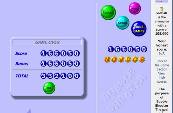 I am a regular abuser of the games section.....Bubble Shoot is my favorite....I played it often and got better and better.....so much so that today I finished the game, hurray! But as a guest! My highscore (over 330.000, enough to beat a certain fish) was not registered Angry
