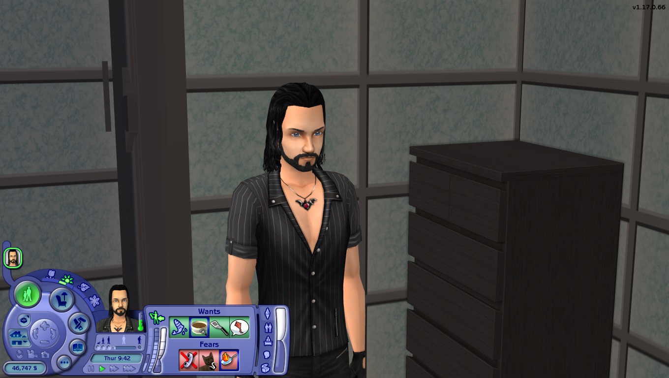 One of the tombstones at my Gothier Green Lawns lot is that of one Andre Hogan, a visiting townie who was eaten by the Cowplant at Doctor Hal Malevolence's old house. Andre's ghost started wandering around the lot (though he rarely got far; the Cowplant and his tombstone were off on a small island in the corner of the lot's pond, and the ghost rarely found his way across the bridge). Then Doctor Hal married Doctor Zenon, they moved to their new home at MegaloTech HQ, Benne and all of the Servos moved with them, and so did Andre (with his tombstone stowed in Doctor Hal's inventory for the transit). Then more recently, after Andre started popping out of his tombstone and roaming around MegaloTech HQ, I got to thinking, "Hal and Zenon have their new son Victor, I kind of don't want Andre messing with little Victor, and besides, why should the Malevolences keep Andre all to themselves when they can show a little altruism and share him with all of Pleasantview's Knowledge Sims (while sowing some discord for all the non-Knowledge Sims as well)?" So after a click or two on Andre's tombstone, I sent Andre to Gothier Green Lawns and planted his tombstone on a nice little grave-sized mound with a flower vase. His ghost still roams around the cemetery for every third or fourth visiting Sim, the last time I checked.
