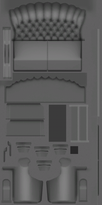 I was crazy enough to take on a remap. It will teach me how to use milkshape/wings/uvmapper, right? So far, I have the fabric subset separated out and remapped and two of the textures more or less reconstructed for the new mapping. The texture is 512 x 512, half the size of the 1024 x 512 original (yet twice the size of the lip loveseat fabric - 512 x 256.)