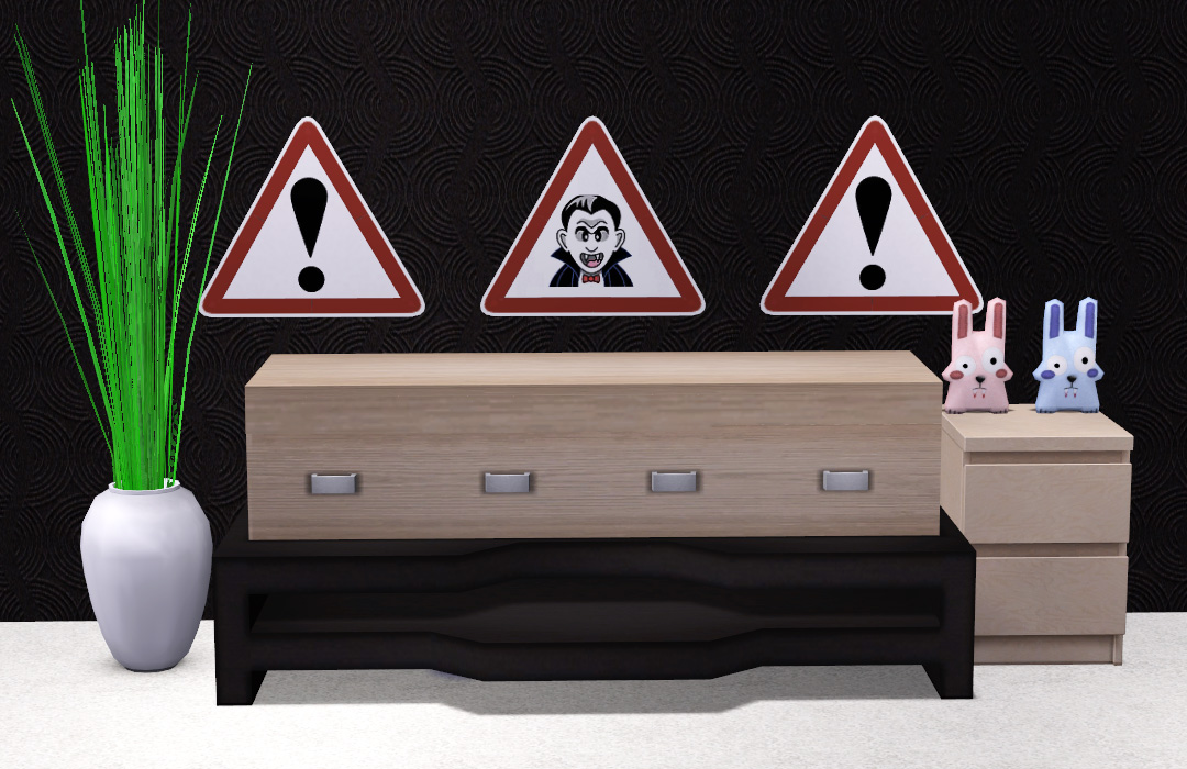 Wait. IT. Not them. The exclamation point is a Maxis painting. The vampire is mine. Well. Mine that I stole from here and pasted on the Maxis painting sorta fast like. But I like it. It's my "beware of sleeping vampire" signage.