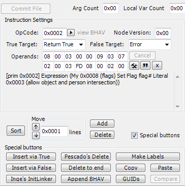 4. Then, use the pop-up wizard (the little button with a hammer and a wrench on it, next to the " button) to change your newly copied line as seen in the first picture. It should say [prim 0x0002] Expression (My 0x0008 (flags) Set Flag flag# Literal 0x0003 (allow object and person intersection)) when you're done - see second picture. Commit and save.