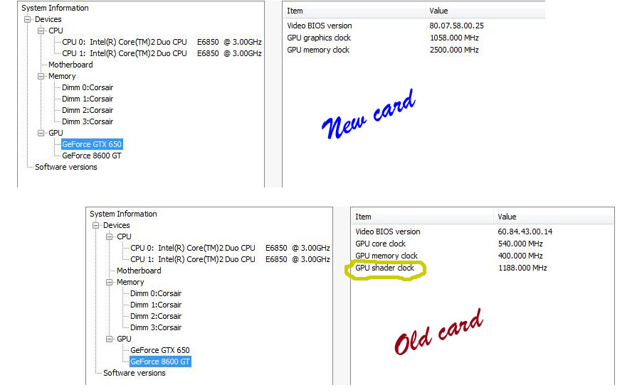 My old card was an 8600 SLI (Nvidia) but, only one of the cards was working. The other card died about a year ago. I think one of the reports I sent you mentioned the old card too - I still have it in there, but I don't want to use it for the sims. And it's not SLI with this one.