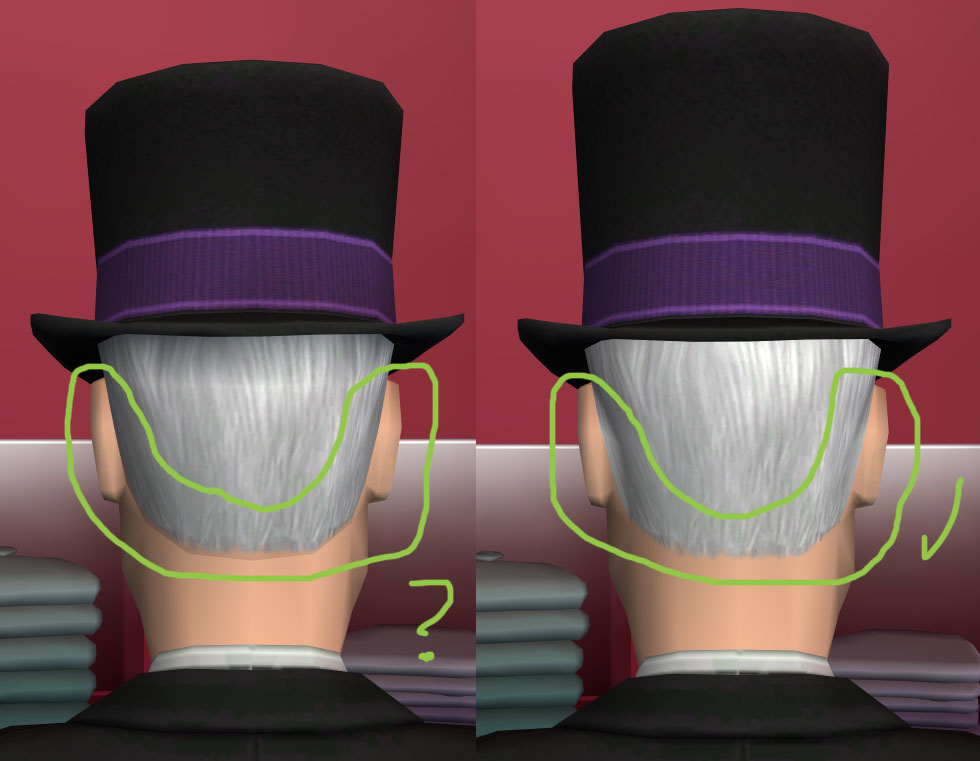 I'm currently working on a shorter top hat from the one already in the base game for Sims 2. I successfully modified the mesh from the base game hat, and it shows in the game. However, there's a problem with the shadows (?) connecting the hair with the head/neck. The skins are not mixing well. Here's the picture: