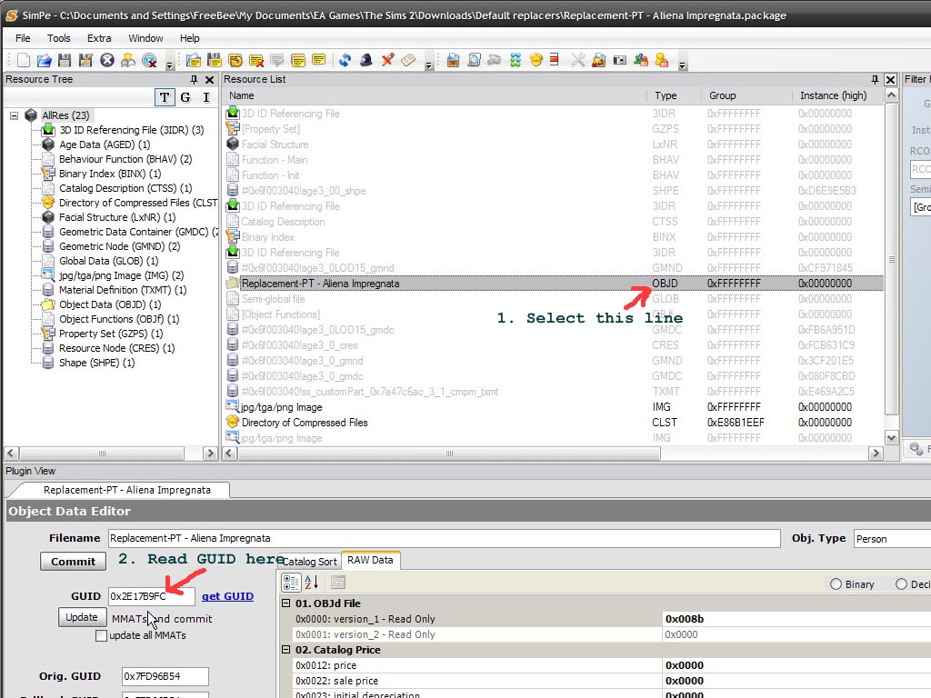 Now comes the somewhat more risky part: editing a mod in SimPE. If you haven't done this before, you may want to make a backup of the original mod first, just in case you blow it and need to start over. I hope to make this manual clear enough that there's little risk of this happening, but still...