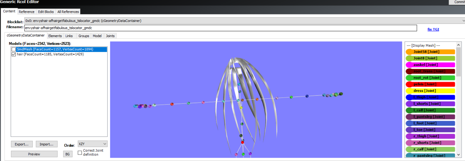 The problem is that hair meshes have bones. If you export as obj then the bone assignments are lost. I only know how to do bone assignments with milkshape using the plugins from MTS.