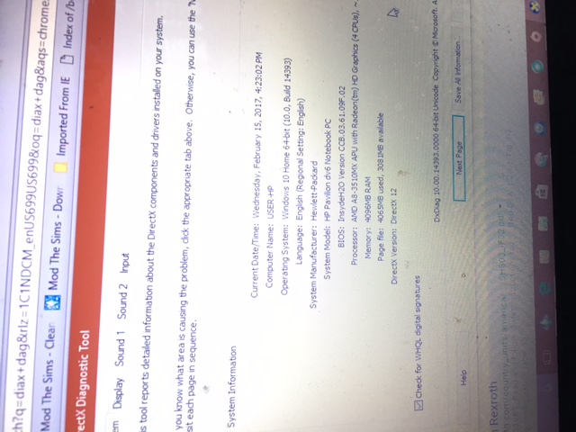 With the DXDiag, rather than attach a photo - could you click on the 'save all information' button which will create a text file.