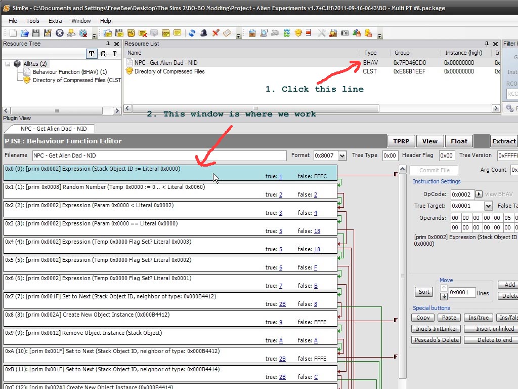Double-click the Multi-PT mod, or Right-click it and select "Open with SimPE". In the Resource List, you'll see a line "NPC - Get Alien Dad - NID". Click that line, and look at the Plug-in view (picture SimPE 001). Here's where modders do their scary work Tongue It's not a lot like making a peanut-butter and jelly sandwich, is it? Big Grin Anyway, let's continue...